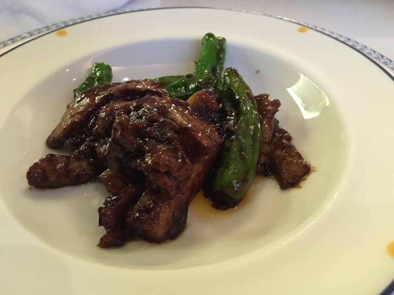ヒレ肉と長芋、ししとうの甘辛炒め、お肉はすごく柔らかくなっています。中国料理では牛肉を柔らかくするような特殊なものがあるとのこと、とろけるように柔らかいです。