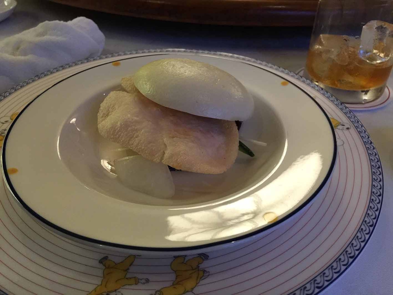 ここで口休め、金環と生姜のグラニテと言う箸休めのようなものが出てきました。シャンパンが終わりワインもそれぞれ白と赤が供されます。昨年は少し緊縮予算でやったので、ちょっと今日は贅沢をしました。幹事として取り敢えず繰越金が残れば良し、今日は個人から会費は取っていません。
