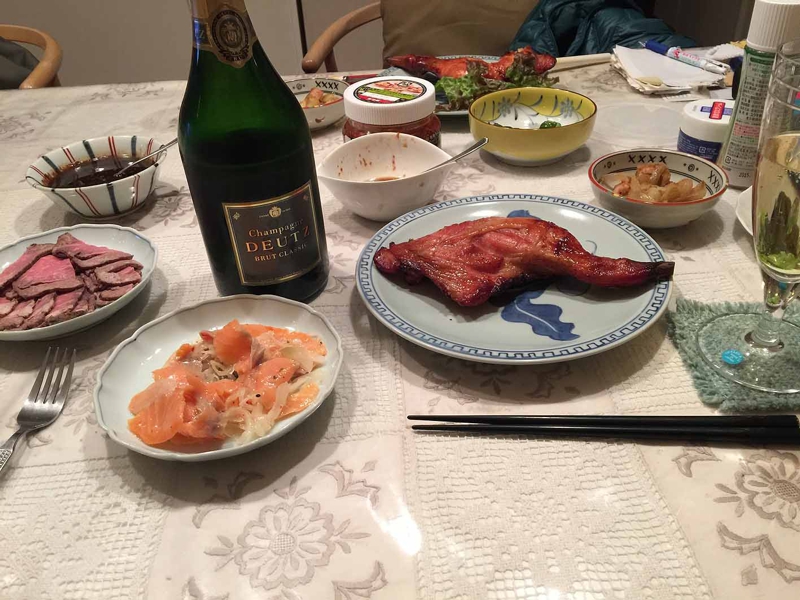 我が家のクリスマス、女房手作りのローストチキンとローストビーフ、スモークサーモンが出てきました。シャンパンはうちのナースがお歳暮にくれたもの、一家3人でボトルが1本空いてしまいました。
