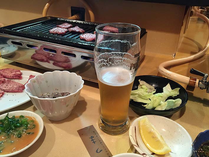今日のメニューは彼におまかせ、リクエストを聞かれて上ミノの塩焼きだけお願いしました。残念ながら好きなコブクロはないとのこと、エル字型のカウンターで10人ちょっと入ればもう店は満席、一席たりとも空いていません。だけどお店には凄い活気があり、いかにも関西、大阪!という感じでした。元気だった店員さんも好感度大、早速タン塩から始まります。今日のお昼も牛タンだったけれど。