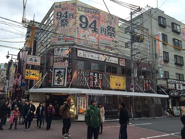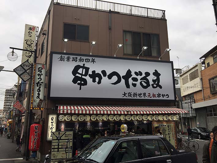 前もってタクシーの運転手さんから詳しい情報を得ていました。串カツはこのダルマと言う店が美味しいらしい、チェーン店でいくつか店があるのですが、全ての店で長蛇の列、さすがにこれに1人で並ぶ気にはなりません。大阪の串揚げなら何処でも良いなどと考えていましたが、もう1軒そのタクシーの運チャンから、並びたくないならこの店と聞いていました。周囲を見回すと串揚げの店は結構あります。