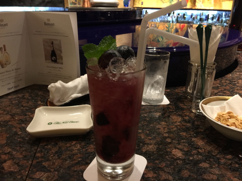 そして最後に先ほどのお薦めのカクテルメニューから、グレープのモヒートをお願いして、これを最後にする事にしました。巨峰とミントの味のコンビネーションが何とも絶妙、なかなか美味しいです。2本のストローで吸いますが、あっという間になくなってしまいました。久しぶりのこのホテル、ウィンドウショッピングして、昔の広間とバーを見て、楽しい夕暮れを過ごせました。