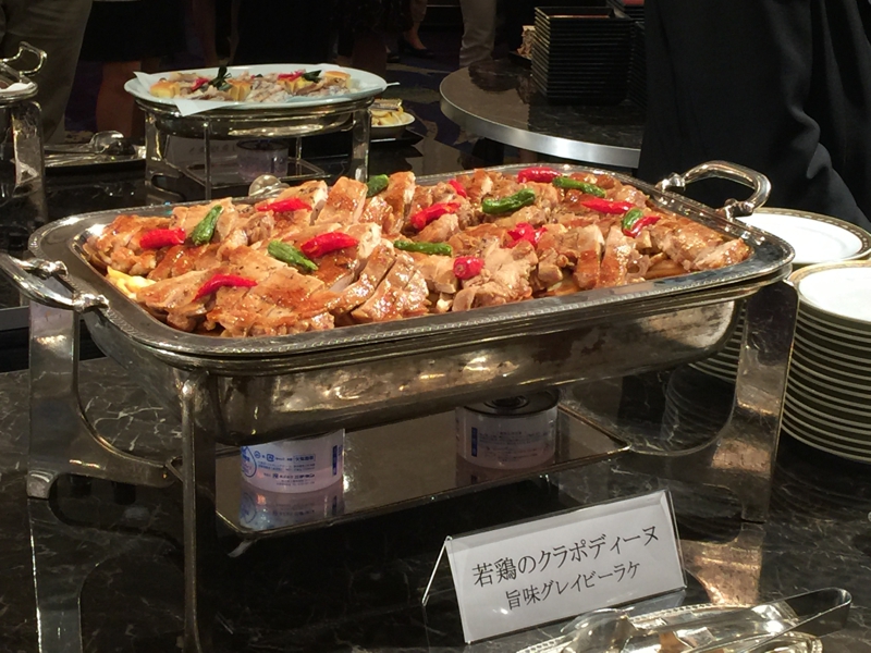 ようやく乾杯の挨拶が終わり、各自テーブルの食事に手を付けます。僕が目を付けたのはこのチキン、艶と言い、色具合と言い、ものすごく美味しそう。しかしこれだけの人数、少しずつしか取りません。やはり人の事も考えなきゃ…、ビュッフェは少しずつ多くの種類を取るのがマナー、しかしそんなマナーが分かっていない奴が時々います。お気に入りをごっそり持って行く奴……。