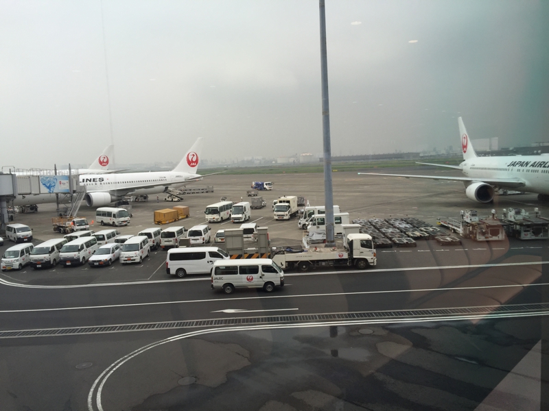 この日の東京は集中豪雨、羽田での離発着が少し麻痺したようでした。空港ロビーに入ってから飛行機遅延のアナウンスが……。その遅延時間がどんどん伸び、結局1時間半遅れることになりました。まぁ後は帰るだけ、今日中に帰れれば良しと考えていましたし、スタッフ曰く、飛ばなくなる事はないとのことでした。