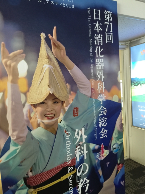 30分ほどで徳島駅に到着、バスの窓にも日本消化器外科学会総会のステッカーが貼ってありました。恐らくそれほど大きな街ではないはず、市内のホテルは全て満室ではないでしょうか? いつぞや循環器病学会で横浜市内のホテルですら全て満室になるぐらいですから。この小さな街では学会の経済効果はかなり大きいのではないでしょうか?