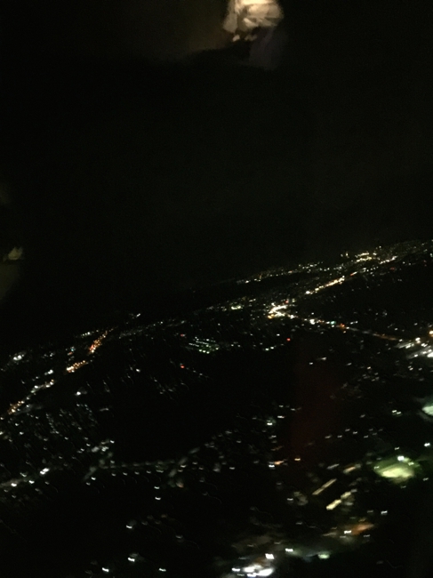 1時間半遅れてようやく離陸になりました。また時々雨が強く飛行機が揺れるかもしれないと言うアナウンスがありました。やだなぁ……、またこのシーンで写真を撮ります。逃げるときの滑走路と違い、仕事へ戻るための滑走路、あまり感動はありません。だけど夜景がきれい。