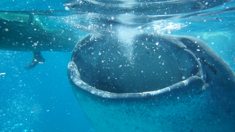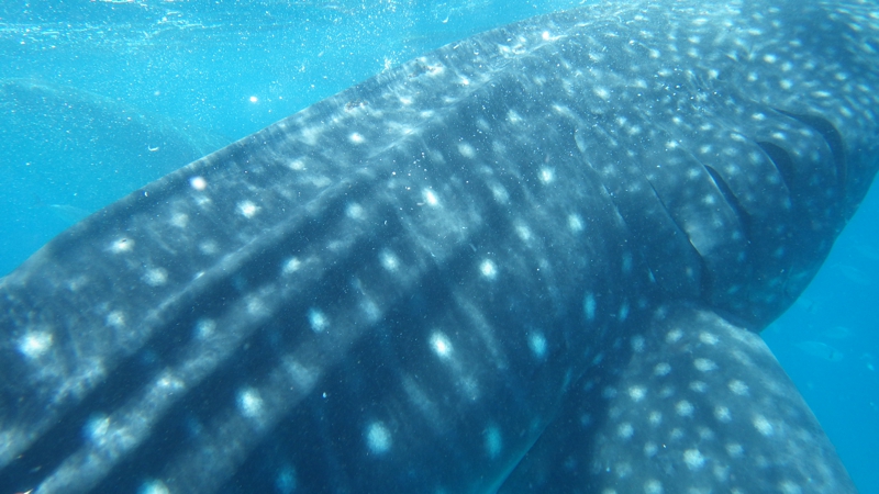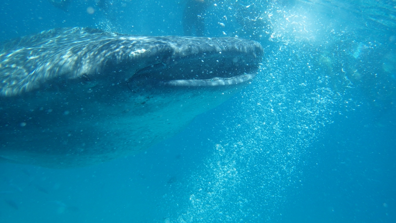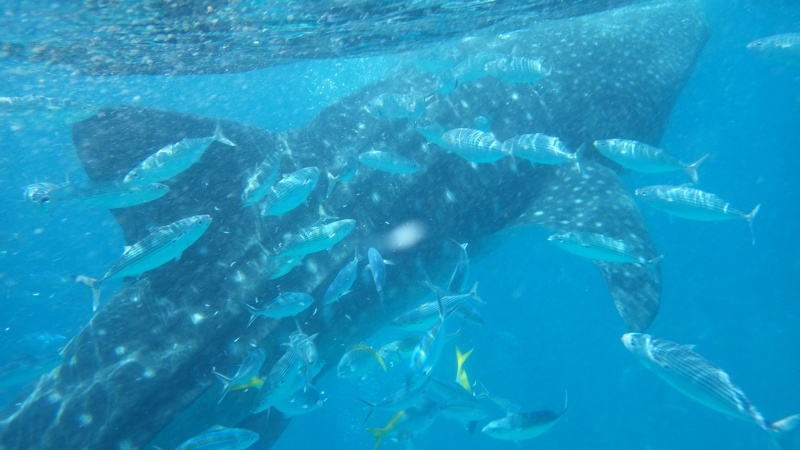 すると今度は違う方向から別のジンベイザメが近づいてきました。これはでかい、それこそ体調10メートル近くありそうです。ボートの上から餌のオキアミを投げているスタッフがいます。そのおこぼれに預かるために小魚もいっぱいます。いや〜、ジンベイザメがいました! 壮観!!