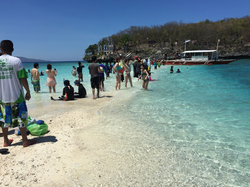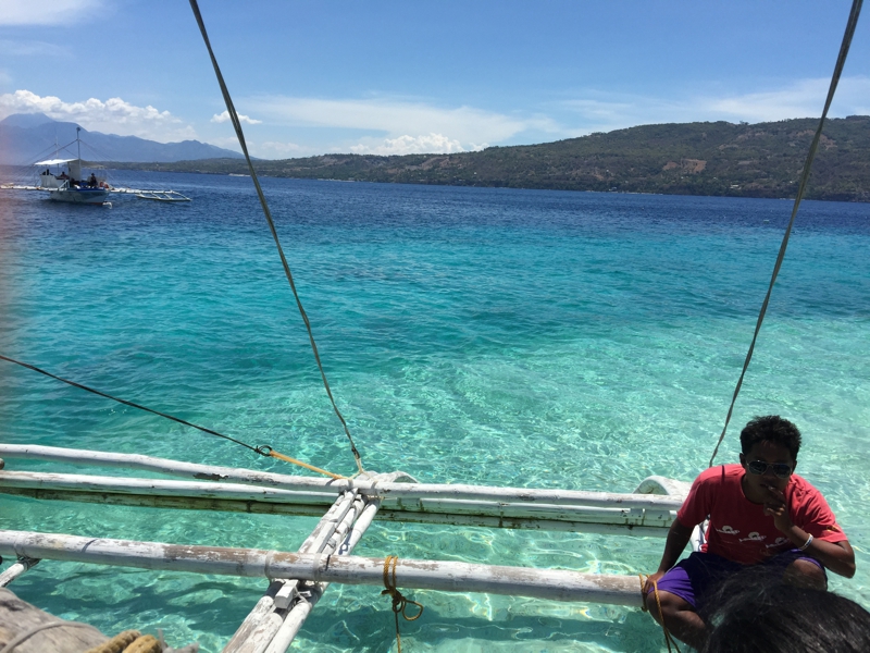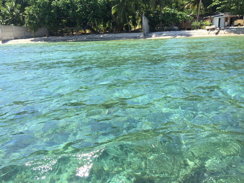 食事の終わった後スミロン島に上陸することになりました。どうです? この青さです。今までセブ島でこんな青い海を見たことがない……。看板に偽りありと思っていた僕の認識が違っていました。2月に行ったマクタン島沖とは比べ物にならないくらい奇麗です。