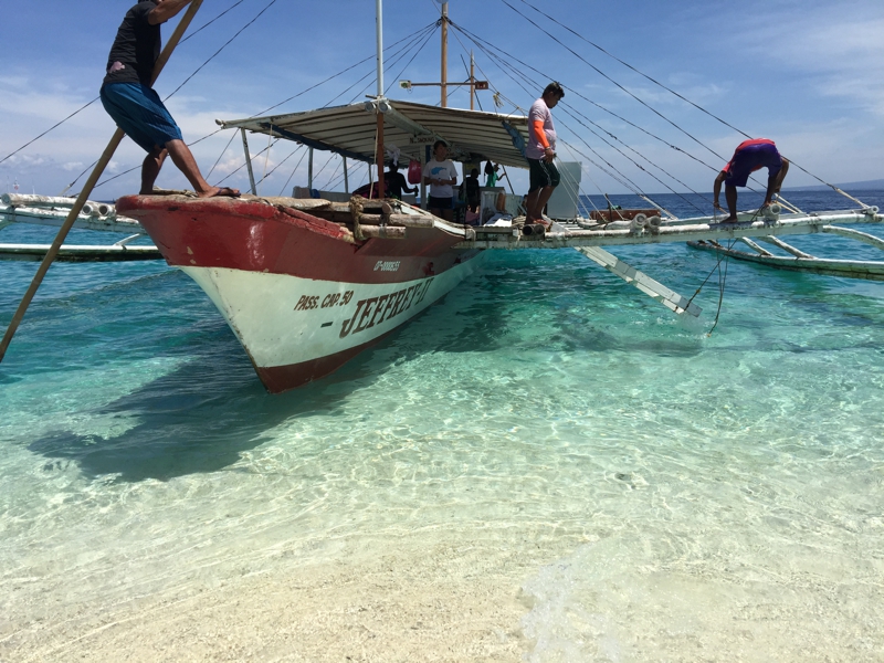 岸から50メートルくらい手前でバンカーボートは停泊、錨を下ろします。波は穏やか、そして天気は最高! もし雨でも降っていればこの青い海は見る事が出来ないでしょう。本当にここに来て良かった! フィリピンは7000以上の島からなる国、まだまだ奇麗な処はたくさんあるはず。