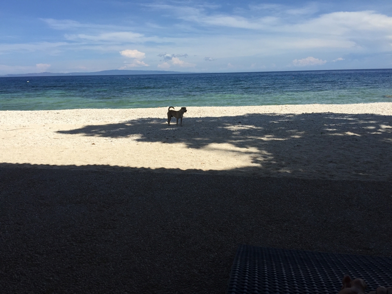 ジンベイザメと最高に奇麗なビーチを充分堪能してまたバンカーボートで船着場に戻ってきました。ここでしばし休憩。ビーチを犬が歩いていました。また我が愛犬のことを思い出しました。元気でやっているだろうか? でもここは暑いからあいつには無理だろうな? ブル系は暑さに弱い。