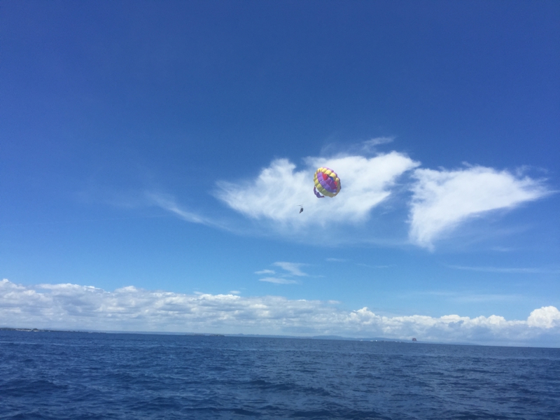 海に出ました。すごい良い天気、僕の真上はほとんど雲がありません。遠くでパラセーリングをやっています。海は穏やか、でもさすがにこの辺、海が深くラグーンではないので青いけれど心ときめく海ではありません。でも最高に良い気分、旅行の後半、たっぷり遊びま〜す。