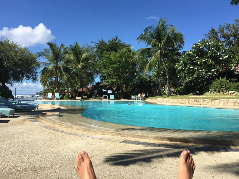 今日は午後12時にはチェックアウト、だから朝早い時間からプールサイドにひっくり返ります。だいぶ日焼けしました。もう真上はほとんど雲がないよう、南国の強い日差しが皮膚を刺しますが、マニラの陽射しほど皮膚にチリチリ来ません。