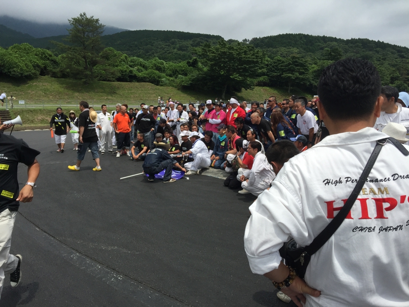パレード参加車にはこんなステッカーが配られます。良い記念だ! しばらく張っておこう。T君に僕だけ参加で申し訳ないなぁ と思っていた処、タンデム走行も許可になるとのこと。ラッキー、じゃぁ、僕の車で一緒に走ろうよ! 途中で交代してT君にも運転させてあげるから! そんなことでちょっと時間が押している中、サーキットへの入場をここで待機する事に。エンジンを掛けて暖気。