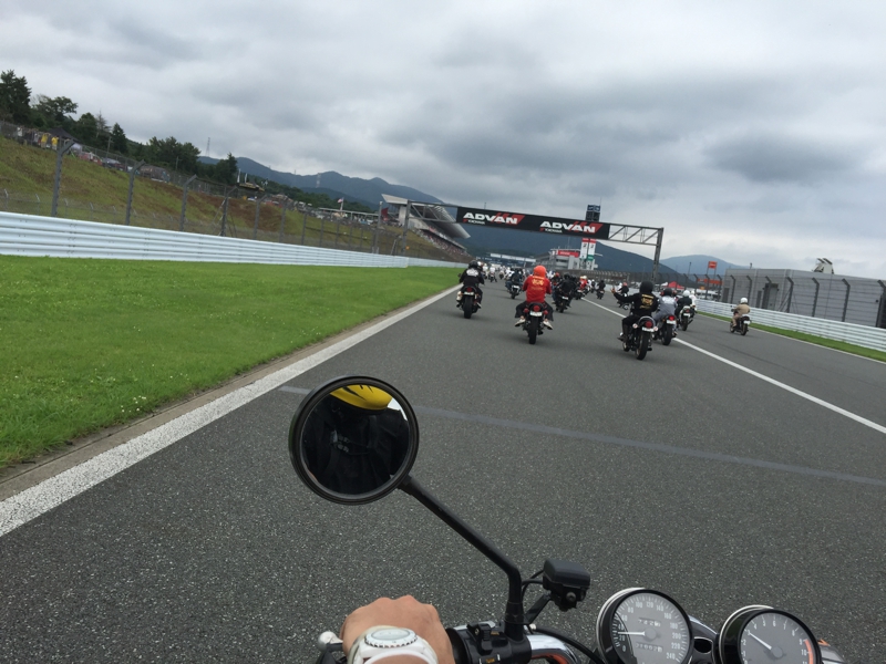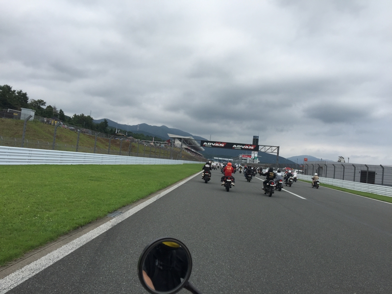 どう? 来た甲斐があったでしょう? 相当な台数なのでパレードの列はかなり長くなっているはず、僕らは割と後ろの方なので、時々渋滞になり、走行は停止になります。そう、車でもここを走ったよね? まぁ、4輪でもここを本気で走る技量を持ち合わせていませんが、取りあえずサーキットを走る開放感は何とも言えません。蛇行しながらサーキットの感触を楽しんでいる人も。