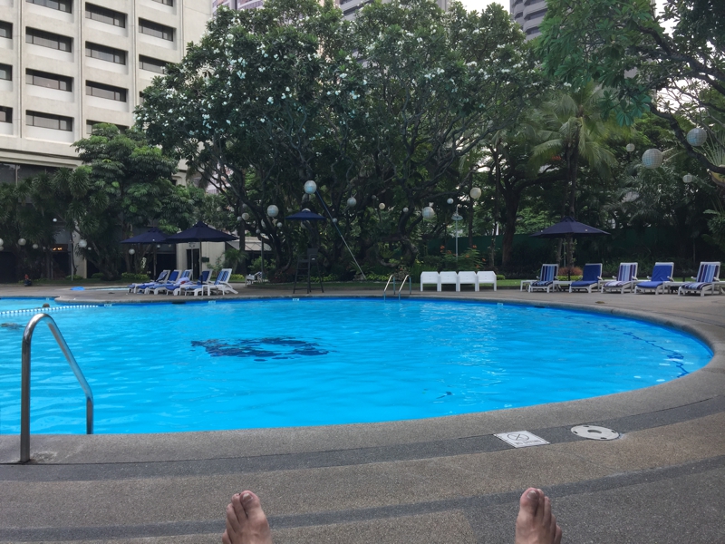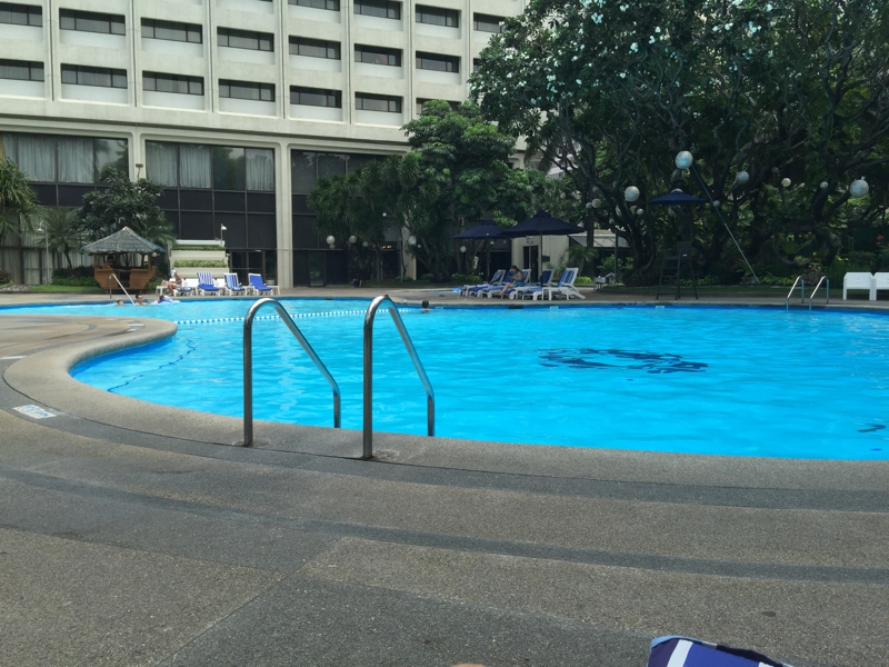 部屋に戻って水着に着替え、プールに来ました。日本の友人達とLINEでメールのやり取りをします。そう、最近はフィリピン国内で使えるルーターを手に入れました。入国してチャージ、約1週間使えるようにセッティングします。ここのプールは深い所は2m以上、思いっきり飛び込めます。