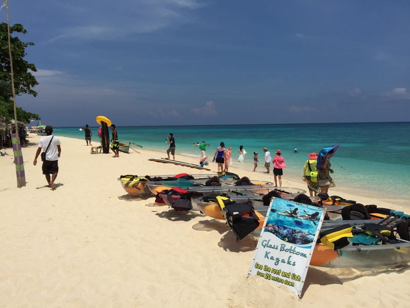 何も変わっていない……、真っ青なビーチが広がります。しかしバイクを使わないでここまで来るのは結構大変そう、トライシクルを捕まえてここまで来るとしたらちょっと大変そうです。波も静か? 本当に青い開発されていない海と白い砂の対照に心洗われます。透明ボート、良さそうだなぁ。