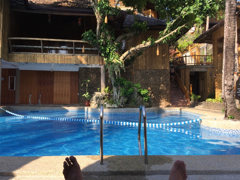 その後は昨年経験出来なかったプールサイドへ。あいにくプールとビーチの間には二階建ての建物があり、海を感じる事は出来ませんが、少しプールで泳ぎもしました。それほど広くはないけど、他に誰もいなくて独り占めです。木造のリゾート風の建物がまた良い雰囲気です。