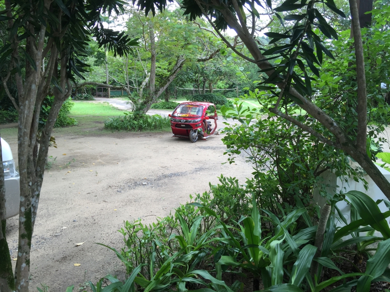少し部屋で食休みしてからまた再度、街に出ることにしました。フロントでトライシクルを呼んでくれる事は昨日のうちに聞いていました。でも多分だいぶ待たされるだろうな? と思いつつ待っていたら何と! ものの10分で迎えに来ました。赤いなかなか格好いい奴……。