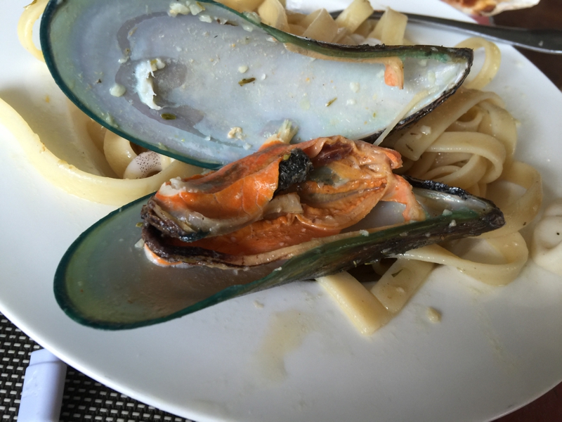 シーフードパスタを頼みました。エビ、イカ、貝が山のように入っています。なかなか美味しい、どうやら昨日のバーベキューを食べても下痢しなかったので、この辺の食事は多分新鮮なのでしょう。パスタはちょっと茹で過ぎ、もう少し歯応えがあった方が良さそうでした。