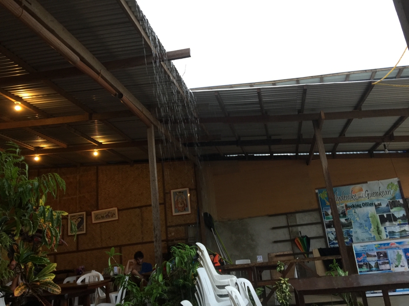 ちょうどカフェから海が見えます。まさにYouTubeに出ていた景色です。正面に見えるのは島、目と鼻の先ですがあそこにも島のリゾートがあるのだろうか? 雨が時折強く降ります。しばらくこの店で雨宿り、せっかく借りたバイクもこの雨では役に立ちません……。