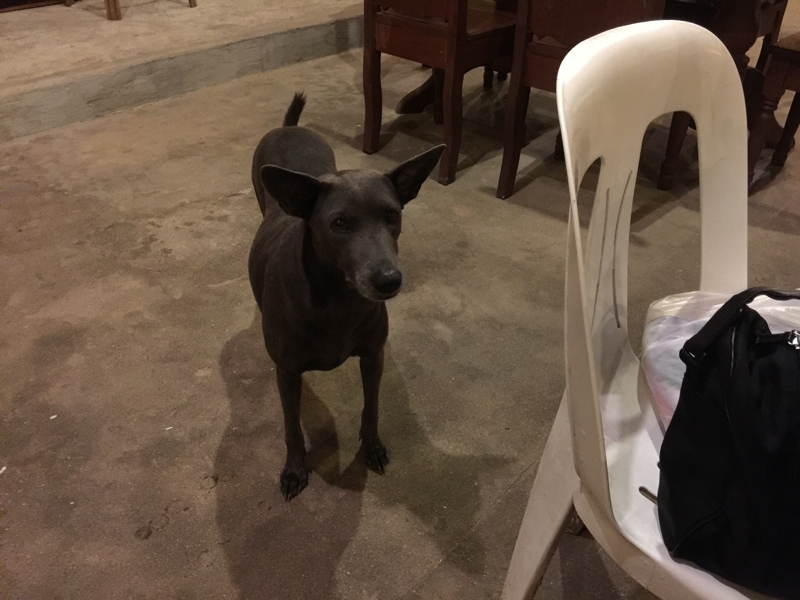 ここで匂いをかぎつけてか、またワンチャン登場……、昨日の犬かな? 物欲しげな顔で僕を見つめます。確かに周りににお客さんがいっぱいいるのに僕を狙い撃ちするように擦り寄ってきます。昨日も君に魚やポークをあげただろ? それを憶えているのかい?