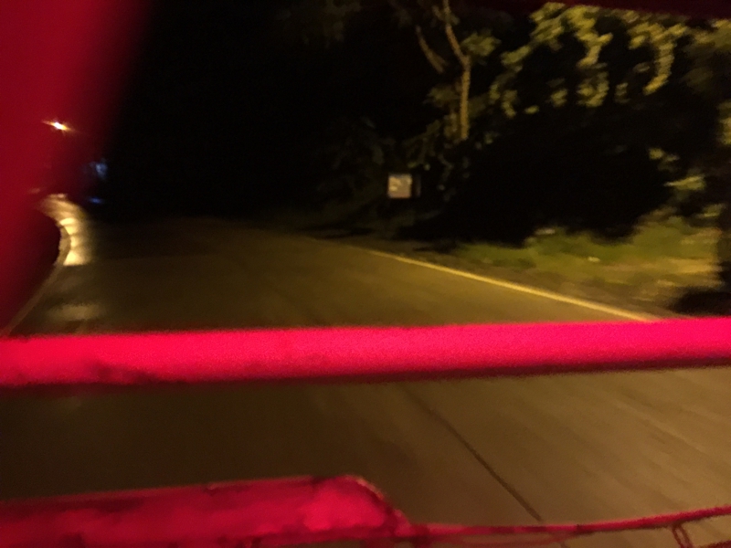 また乗り心地の決して良くない昨日と同じトライシクルに乗り込みます。雨は結構降って来ています。夜走るとこの辺は真っ暗、おそらく放り出されたらなすすべもないでしょう? 後ろを振り返ってみるとライト、街灯のない道は真っ暗、何も見えません。