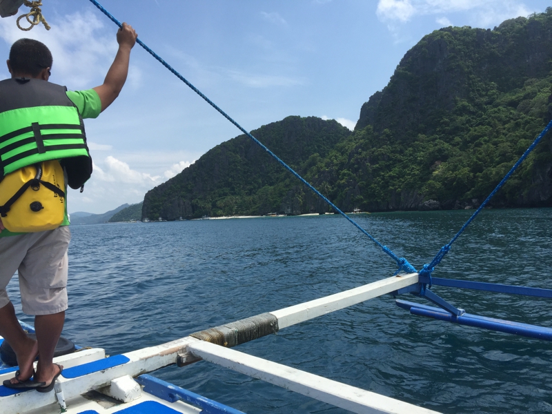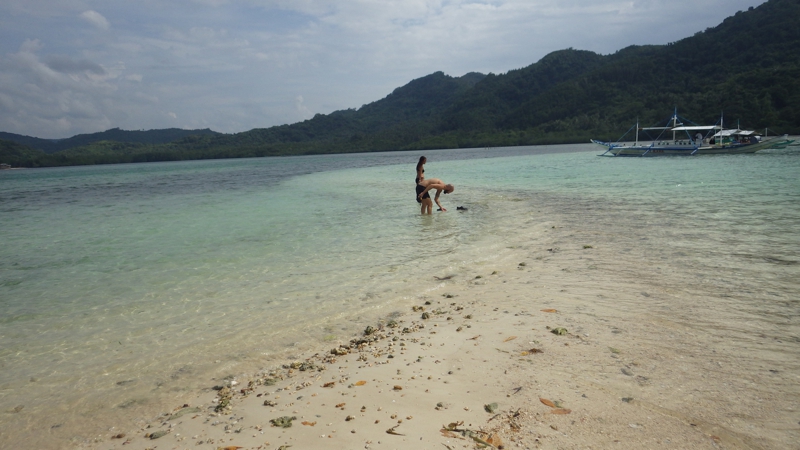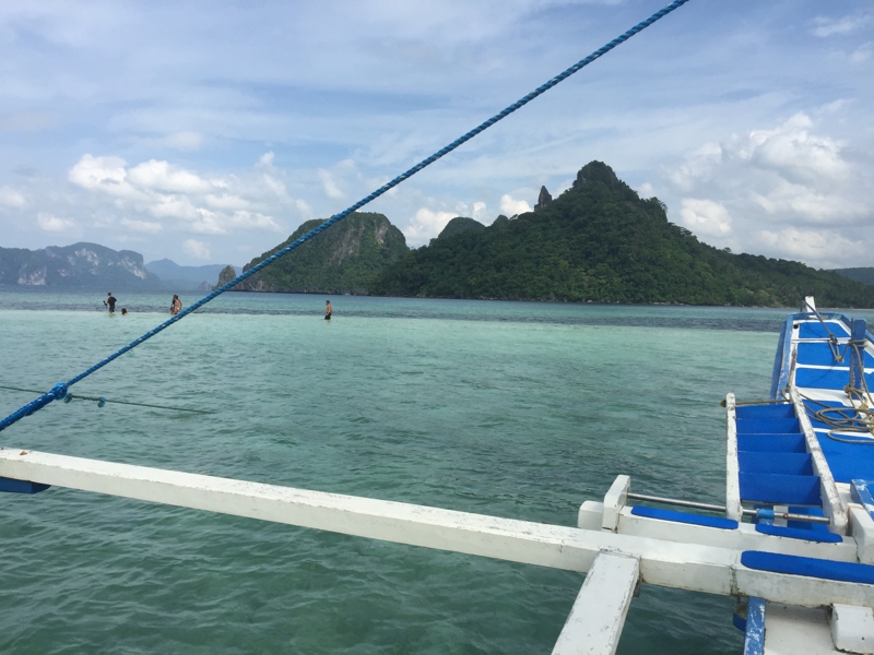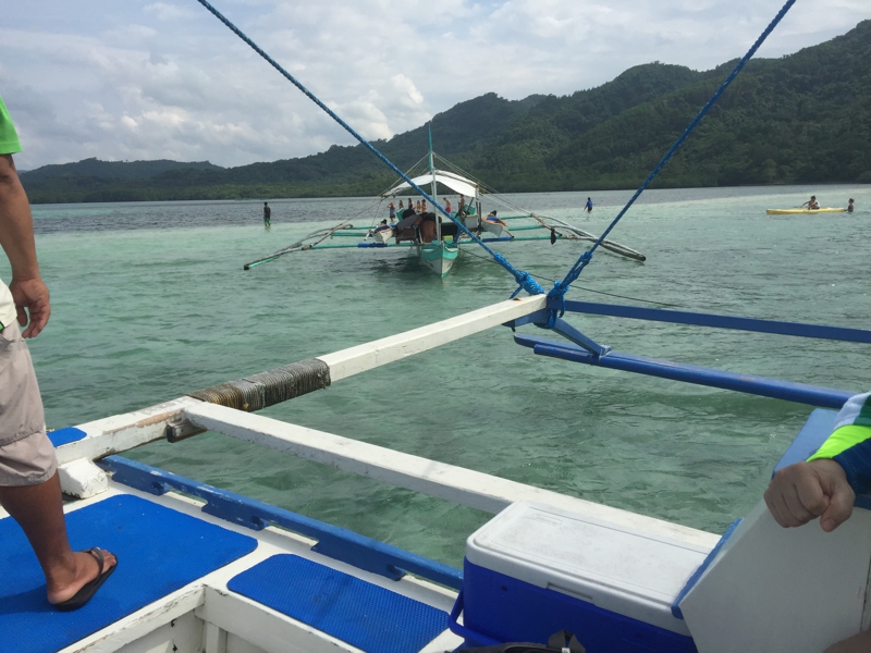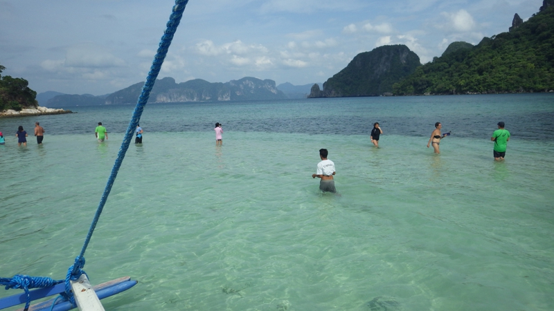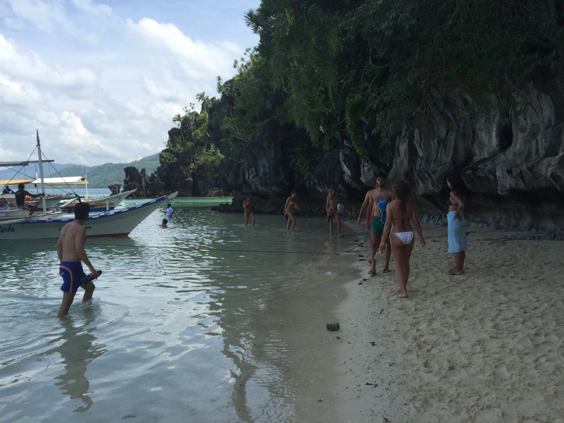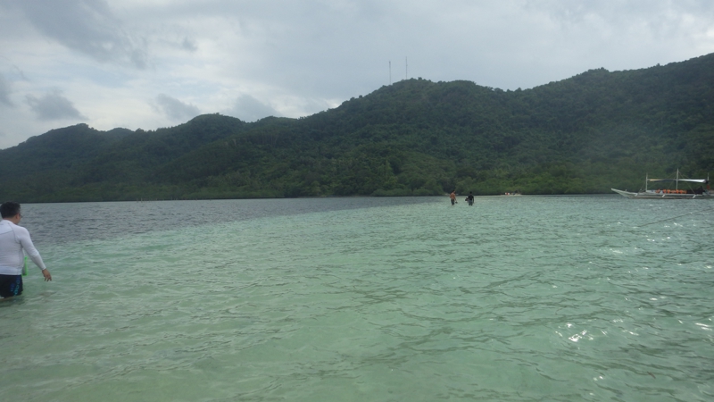 入り口から離れてバンカーボートが止まったビーチの方に出て行きました。この周囲、海はそれほど青いわけではない、特に施設もなく、宿泊施設もないようです。でも周囲には恐らく色々なリゾートやパラワン本島から来たバンカーボートがたくさん、それぞれにガイドがつきます。