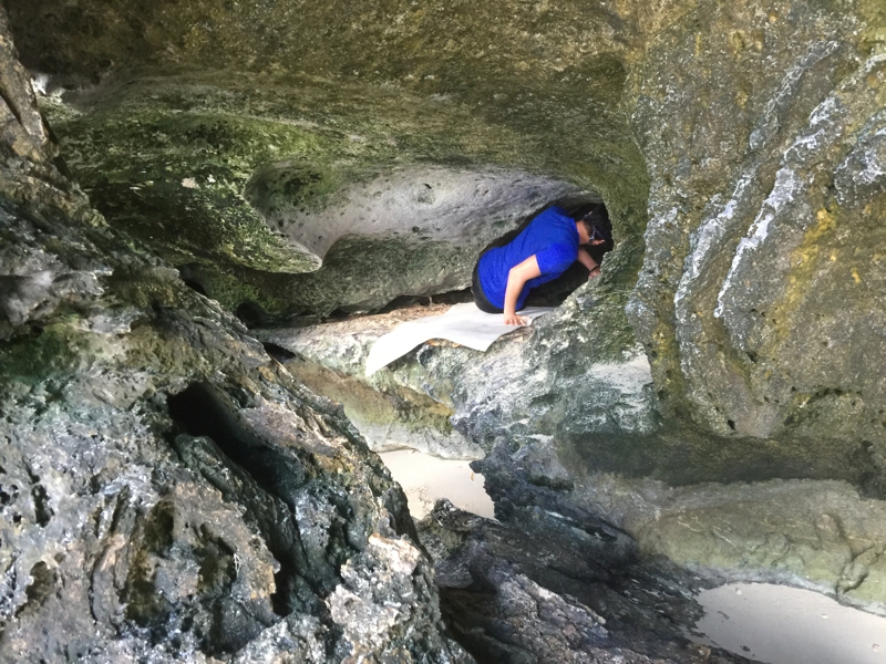 どうやら洞窟があるよう、洞窟の入り口に来ました。ガイドが先導して順番にゲストが中に入って行きます。ずらっと観光客が並んで中に入る順番を待っています。何かだいぶ時間がかかりそうです。ビキニのカッコいいお姉ちゃんもいます。