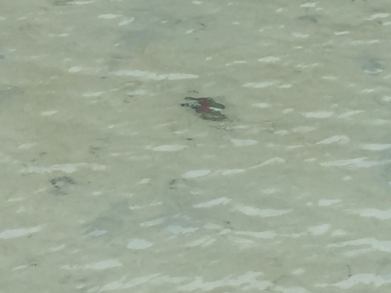 後ろを振り返るとやはりこの浅瀬は蛇のように曲がりくねっているようです。これがスネークアイランドと呼ばれる所以、海の水の色はそこそこ青いのですが、やはりそこは薄曇り故、もし陽が射すようなよい天気ならばもっと青い素晴らしい海の色になるのでしょう?