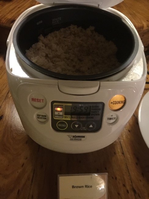 ブラウン・ライスってのがありました。茶色い米? 味見はしませんでしたが、ちょっと匂いが気になり、恐らくあまり美味しくないフィリピン独特の安い米と同じ匂いでした。やはり米は日本米に限る! 高いけど日本の米が一番です。米が入っているジャーは象印でした。