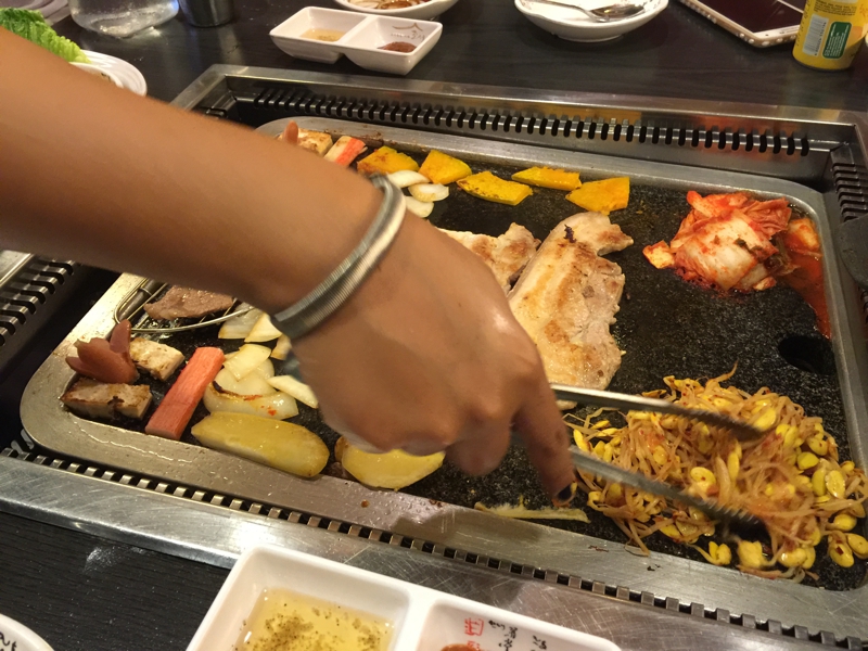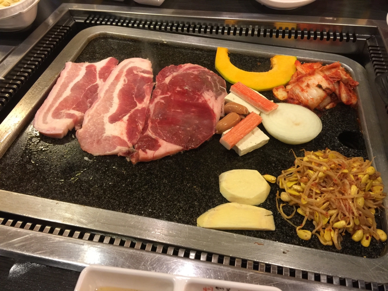 I felt hungry for a while and I came out the hotel. There was the new Korean barbecue restaurant on foot for 2 minutes from my hotel. The meat of the signboard of a table truly seemed to be delicious. I entered and went so that it might be inhaled. As for a menu, only English and Korean order. I ordered Rib eye & Pork BBQ which can go♪ Also for a visitor only in about a South Korean, as for this♪
