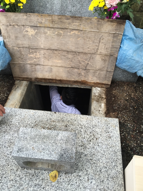 さて、もうお墓に我々一家が着くと、ちゃんと蓋を開けて、後は骨壺を安置するだけのところまで準備は出来ていました。僕がこのお墓の下を見るのは親父が死んだ28年前以来? その時の記憶は全くありません。えっ!? こんなに深いの? 人間一人が中で立っても頭が出て来ない深さ? 本当におふくろは此処に入りたかったのかなぁ? ま〜た親父にいじめられるかも知れないなぁ? 何とも不思議な思いです。長男がその中に入ってみました。お前もいずれその中に入るんだぞ? その前に父さんだけどな? 僕も正直、あまりここに入りたくない……、ま〜た親父と喧嘩になる……、チラッと海に散骨なんて手もあるよな? 僕は海が好きだから……、そんなことを女房につい漏らしました。まぁ、28年間、ここに