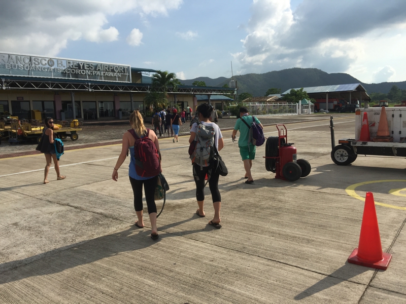 空港の建物もエルニド空港よりはだいぶまし、一応コンクリートで出来ていそう、エルニドは木造の茅葺き屋根でしたから。僕は前から6列目、すぐに飛行機を降りました。取り敢えず地べたを歩いて100m程先の空港の施設へ向かいます。乗員は4×10列で40名ほど、ほぼ満席でした。