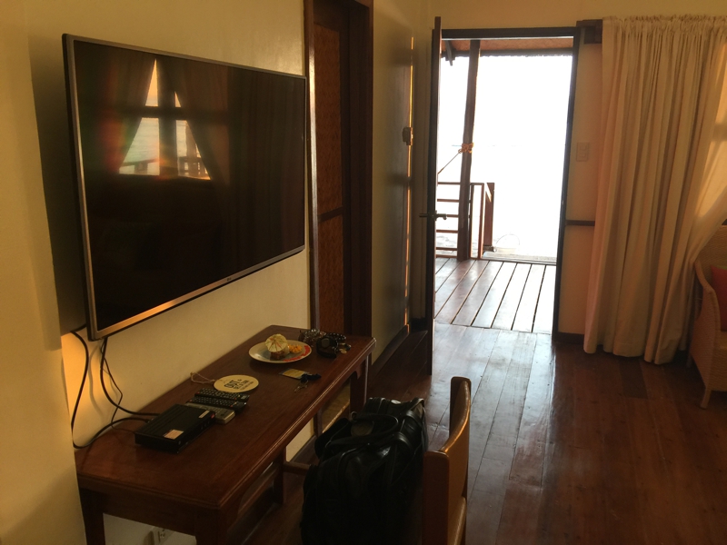 部屋に入りました。なかなか綺麗、テレビはないと聞いていましたが、大きなモニターが壁に張り付いていました。どっちにしろテレビは観ないけれど。そして入り口のドアを開けると15m先がもう海辺なのです。イヤ〜♪ 良い処ですよ! 宿泊費もそれほど高い訳ではないのに。