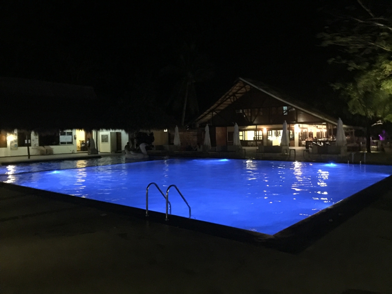 夕食を摂りにレストラン棟に向かいます。途中に先ほどのプールが。青いライトでライトアップされていました。またちょっと足を浸けてみるとやっぱり温水状態。昼間はよほど暑いのか? この中で泳ぐのはちょっと辛そう。明日はこのプールサイドでまどろむ事になります。