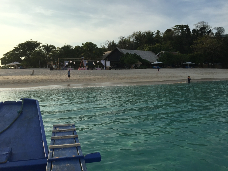 船着き場を出てからノンビリ走って約30分、目的地に到着です。飛行機が遅れて暗くなり、結局ホテルにたどり着かないのではないか? そんな一抹の不安もありましたが、結局ほぼ予定通りに離島のリゾートに到着しました。リゾート前はホワイトサンド、そして海が綺麗な事は知っていました。