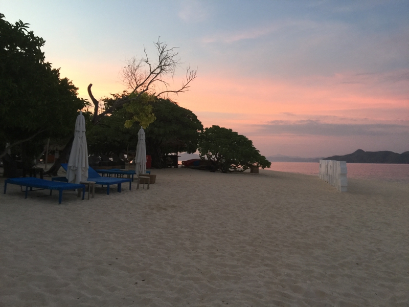こちらは西の空、未だ夜が明け切っていないような感じ、波も穏やか、反対側にあるのはブスアンガ本島、目の前に大きな島があるので、こちら側が津波にやられる事はないでしょう。未だリゾート内は眠りからは醒めておらず、静かな時間がゆっくりと流れています。新鮮な空気、生き返るようです。
