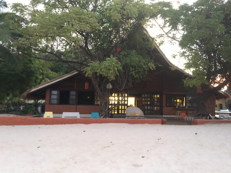 僕の部屋のテラスから海を眺めている図、こんなビーチサイド、オーシャンフロントの部屋を宛てがってもらうなんて予測していませんでした。このテラスにもハンモックと椅子があり、海をジッと眺めていられるのです。幾らでも座って過ごせそう。ようやく日が昇ってきました。