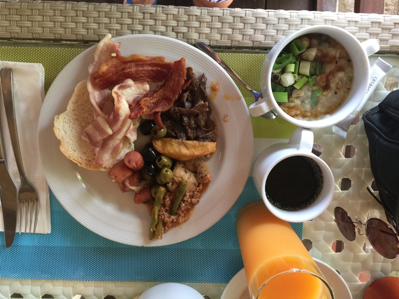 結局今日の僕の朝食はこんな感じ、パンにベーコン、欧米の食事のようですが、ちょっと脂肪分が多いか? お粥は専用の醤油(ナムプラー?)を入れるとなかなか美味しかったです。まぁ、カロリーを摂り過ぎてしまう種類豊富なビュッフェよりはむしろ健康には良いのでしょうか?