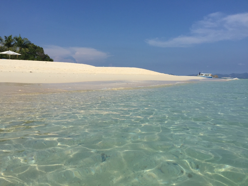 レストランの料金はきわめてリーズナブルなもの、昨夜自分に奮発したステーキも2000円ちょっとの、フィリピン価格としてもリゾートのレストランとしては問題ないものでした。お腹も満足して、今度は海辺に転がっていました。海の中から見るホワイトサンド、綺麗です。