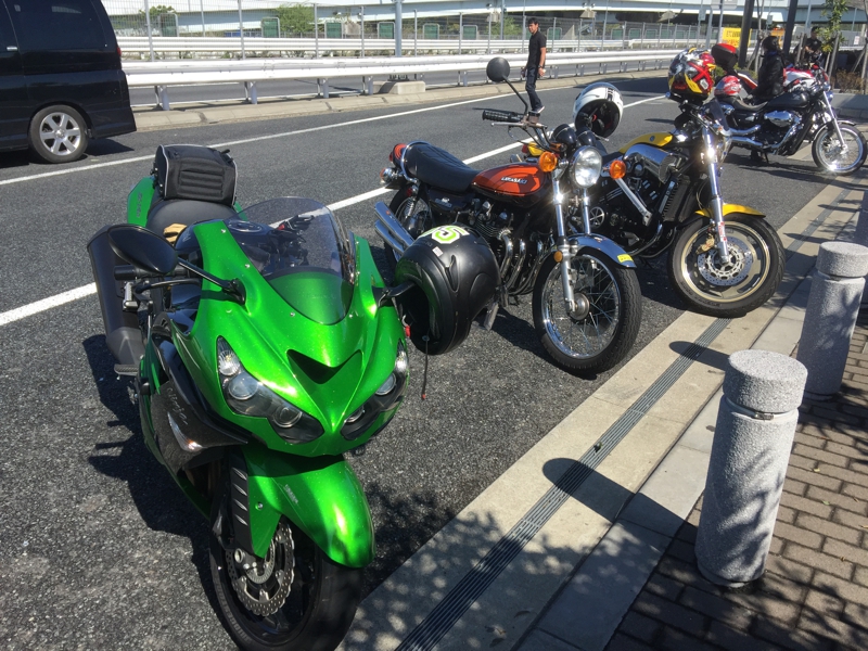 アクアラインから帰りは海ほたるで少し休憩することになりました。みんなで固まってバイクを停めると……、偶然にもKawasakiの火の玉が3台並びました。あれ〜、これ絵になるよ〜! 本当に偶然なのですが、僕が気付いてい皆に知らせました。ちょっと僕のバイクのオレンジ色は少しくすんでいる? でもみんな珍しいノーマルマフラー、ヨシムラの黒い集合管よりも絶対に良いです。