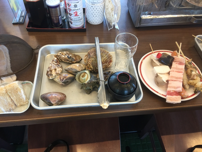 僕の選択はこうなりました。蛤、サザエ、ホタテ、牡蠣、ツブ貝の串焼き、海老の串焼き、エリンギ、カルビ、そして海苔汁、焼きおにぎり2ヶ、そして飲み放題のドリンクバー、もちろん残念ながらビールは飲めません。これで総額6千円ちょい、まぁランチとしてはかなり贅沢ではありますが、みんなで来たバイク・ツーリング、これくらいの出費はやむを得ないかな? 支払いを終えて席へ。