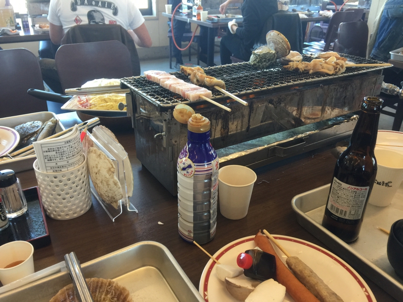 ウワー、楽しそう、美味しそう! 蛤、サザエ、鮑もあります。各自水槽や冷蔵庫から好きな物をバイキング形式に取って、最後に清算してお金を払い、テーブルに着いてロースターで自分で焼いて食べるシステムのようです。これは楽しい! むしろ席について注文するより、自分で好きな物を見ながら食べたいだけ取れるので、何ともワクワクします。鮑……、ちょっと高いけれど行きます!