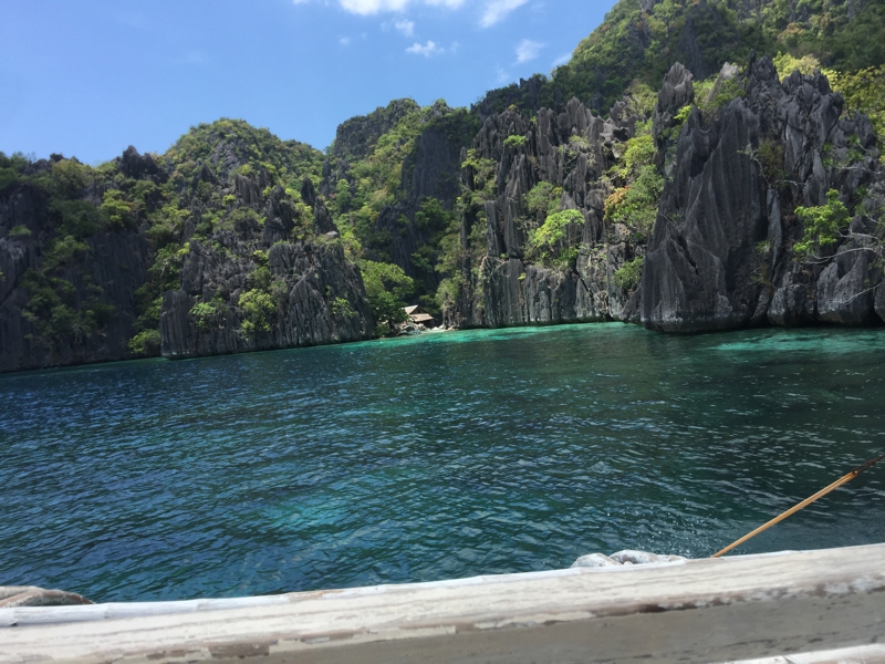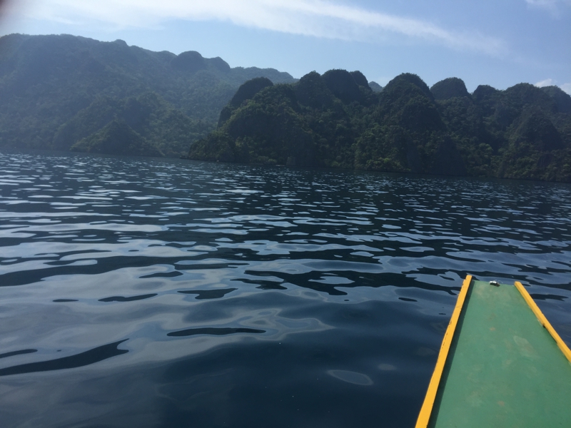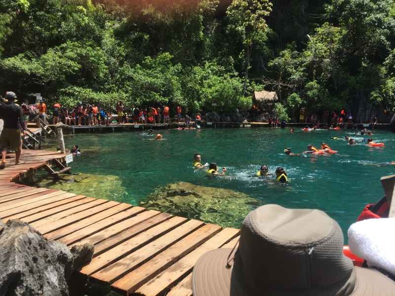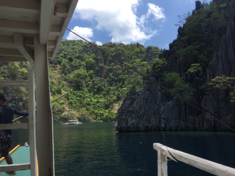 次に向かうのはナンバー2の観光スポット、ツイン・ラグーン、エルニドのビッグラグーン、スモールラグーンのような絶景を期待していました。ガヤンガン湖からバンカーボートで15分ほどの処、コロン島の縁を回り込むように船は進みます。岸辺はきれいなラグーンになっていて緑色!
