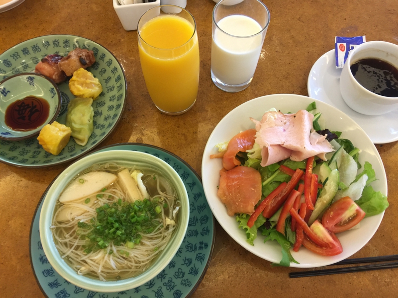 今までのリゾートでの朝食ビュッフェは何となく物足りない、僕にはボリューム不足でした。やはりこのホテルの朝食ビュッフェは僕には一番合っていそう、何を食べるのか選ぶのに迷うと同時にワクワク感があります。やはりこのホテルのフォーは逃せない、たっぷりサラダに肉料理少々。