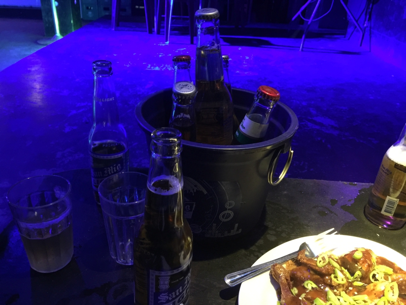 ひょんなことから現地の知り合いに引きずられて、T君と一緒にホテル近くのパブで飲む事になりました。ビール1本だけで良いと言ったのにバケツで取れ と言われてこんな風に。ディスコ風にロックがガンガン流れ、照明もなかなかムーディなお店でした。みんなでカンンパーイ!