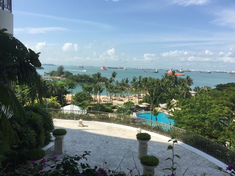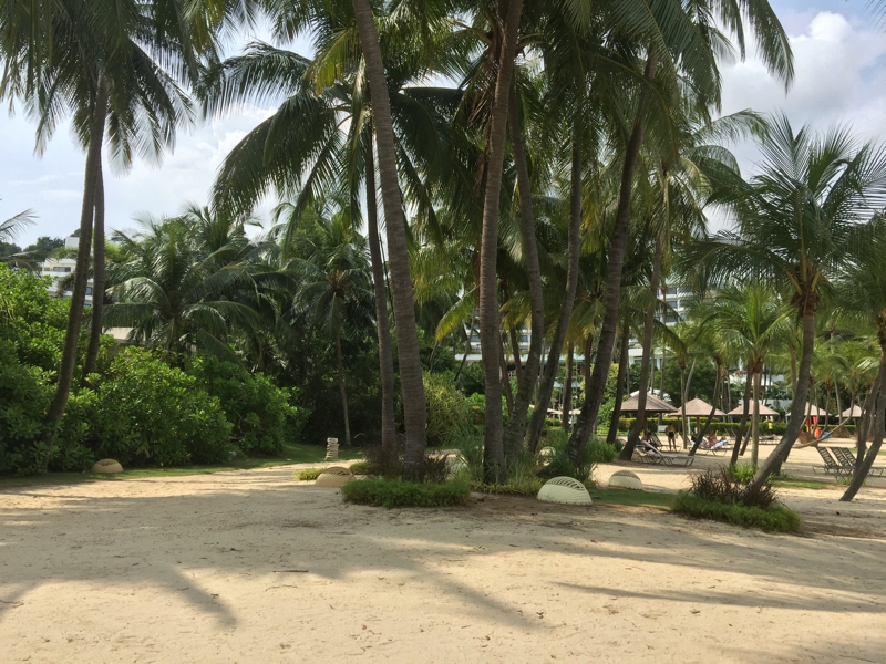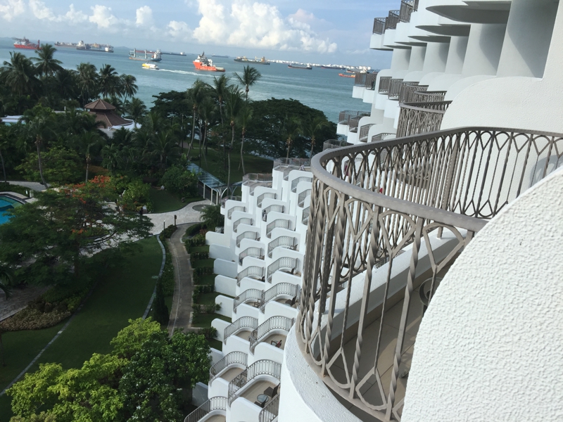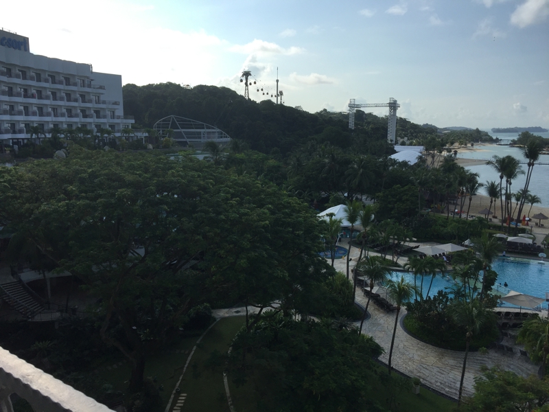 ベランダに出てみました。深呼吸をします。しかし……、エルニドやブスアンガのような爽快な気分! と言う訳ではないよう。確かにここはシンガポールのリゾートかも知れないけれど、車で20分走ったらアジア先進国の中心街、大都会。海もめっちゃ青い訳ではなく、現実から逃げて来た開放感はあまり感じませんでした。バンコクにいてもそんな開放感はあったのに。やはりいつもと違う?