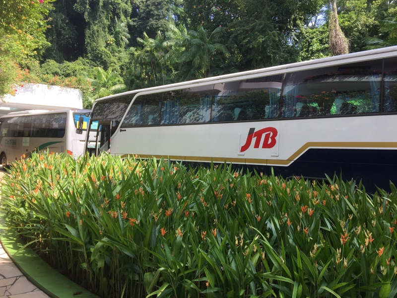 取り敢えず無料のシャトルバスでユニバーサルスタジオへ行ける事は掴んでいました。ホテル内にそんな観光のためのカウンターがあり、気軽に相談出来ます。しかもそこで入場券を購入する事が出来ました。数百円、しかしこの時点で買っておいて良かったのです。もしここで買わなければ、長蛇の列に並ばなくてはならないことになるところでした。ホテルのエントランスにはJTBのバスがいました。