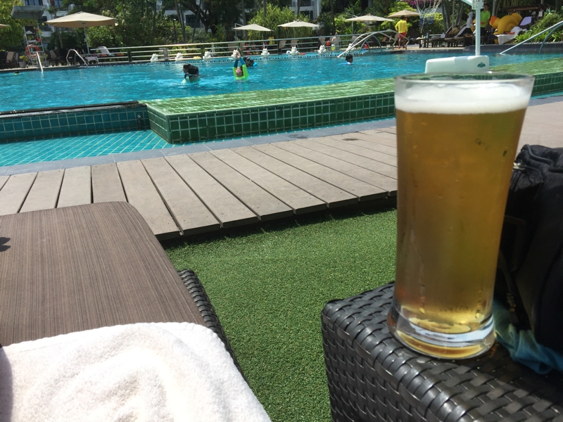 さて、自室で一休み後、プールに出て来ました。お天気はまずまず、そこそこ暑いのですが、ジッとしているのが耐えられない程の暑さではありません。8月のシンガポールはメッチャ暑いよ! と悪友に脅されましたが、それほどでもなさそう、デッキチェアに転がって音楽を聴いていれば、いつものリラックスタイムを過ごせます。ここのぷーるはなかなか大きく泳ぎ甲斐があります。ああ、幸せ〜♪
