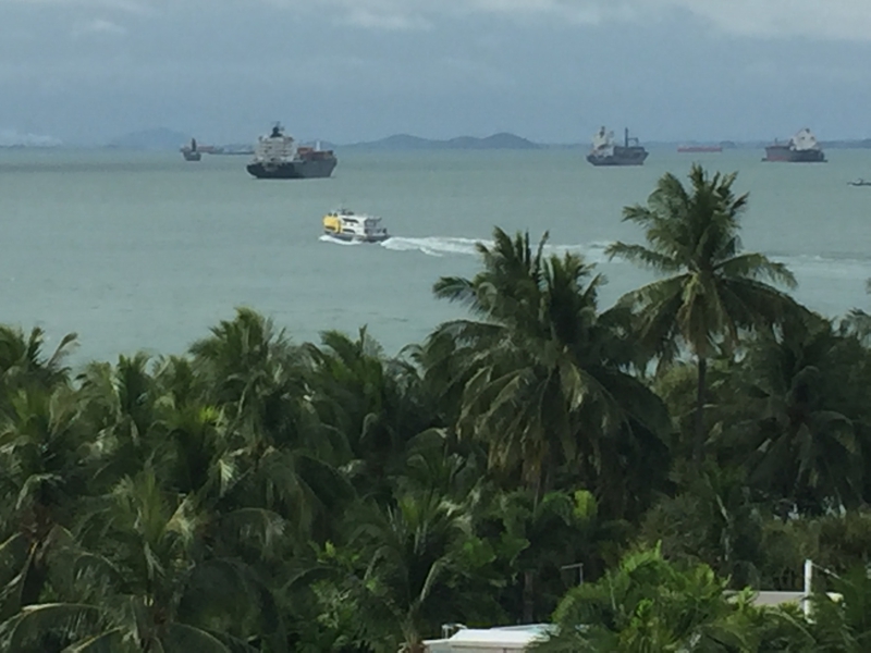 オオ〜! なかなか速い、快感、快感……、乗り心地も決して悪くありません。音も静か、エンジンの音もせずにグイグイ前方に進みます。360度ほぼガラス張り、キョロキョロあちらこちらを見回します。進行方向右手はもうマラッカ海峡の海、遠く貨物船やタンカーが浮かびます。海は決して青くはない、今朝はやや曇りがち、どんよりとした鉛色の空に海の色もくすみます。